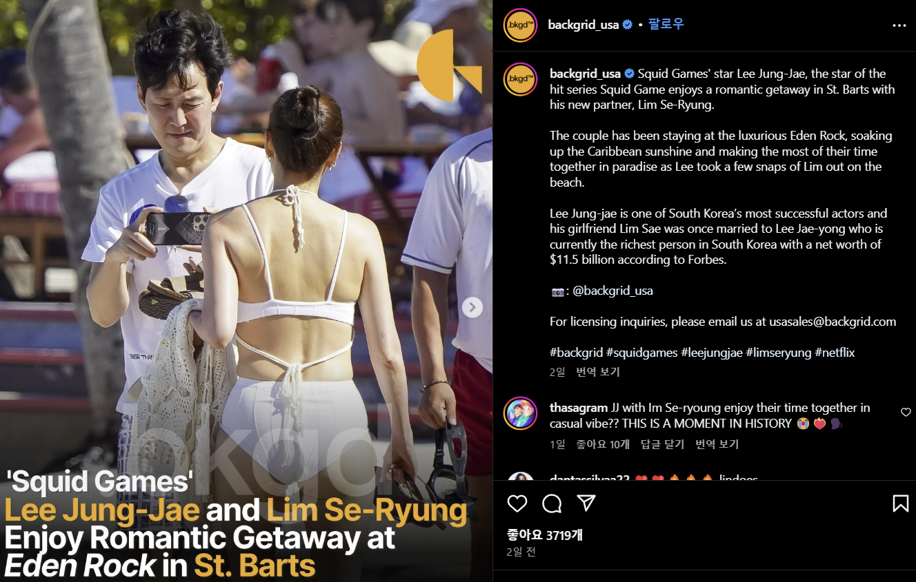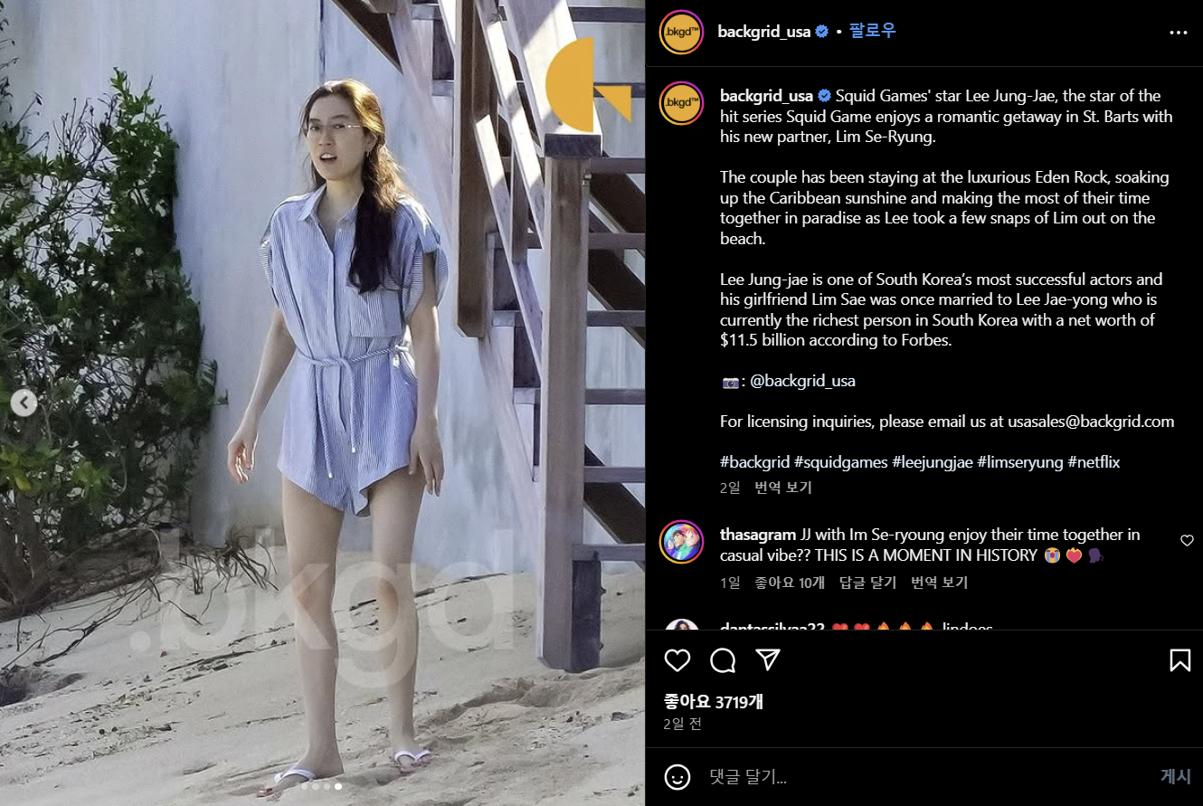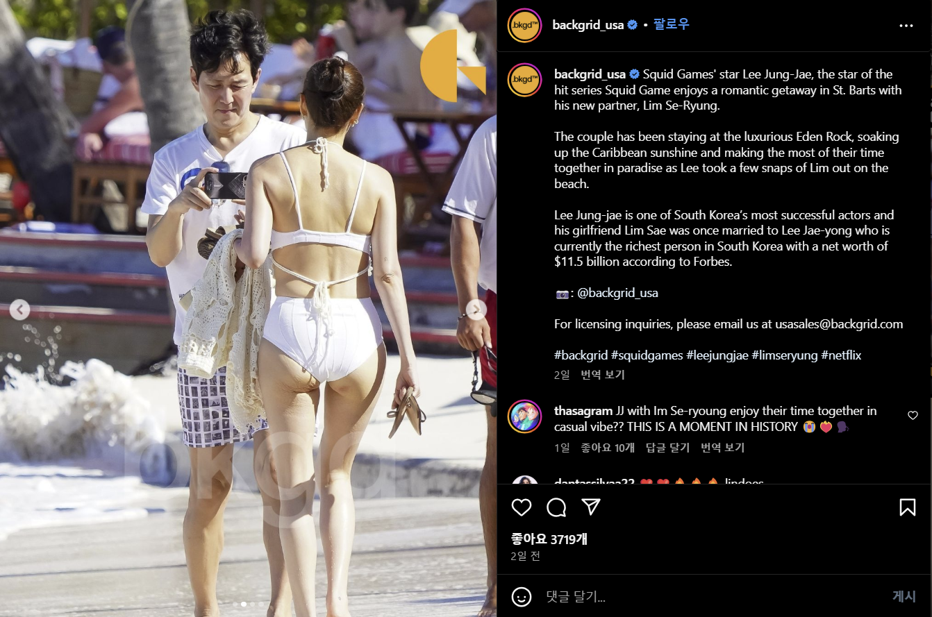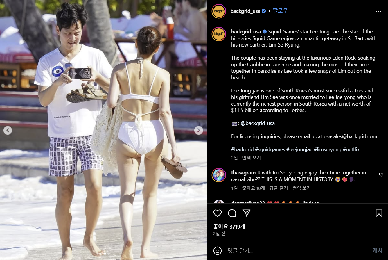 배우 이정재(52)와 임세령(47) 대상그룹 부회장이 카리브해에서 휴가를 즐기는 모습이 포착되어 화제를 모으고 있습니다. 지난달 30일, 미국 연예 매체 백그리드는 "이정재와 임세령이 카리브해의 세인트바트섬에서 로맨틱한 시간을 보내고 있다"며 두 사람의 사진을 공개했습니다.