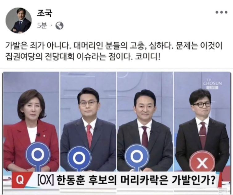 2024년 7월. 조국 전 조국혁신당 대표는 과거 국민의힘 당대표 경선 첫 TV 토론회의 한 장면을 합성한 사진을 자신의 SNS에 게시했습니다. 사진 속에는 후보들이 한동훈 후보의 머리카락이 가발인지 여부를 묻는 질문에 답변하는 모습이 담겼습니다.